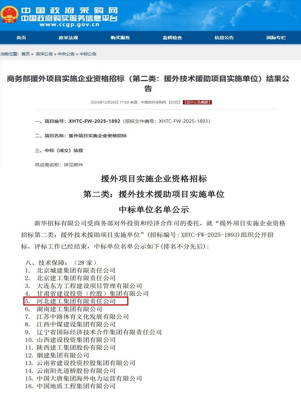 喜讯!河北建工集团中标 商务部援外技术援助项目实施单位资格 近日,商务部正式公布了《援外项目实施企业资格招标(第二类:援外技术援助项目实施单位)结果公告》,河北建工集团成功中标,获得援外技术援助项目实施单位(技术保障)资格。 技...